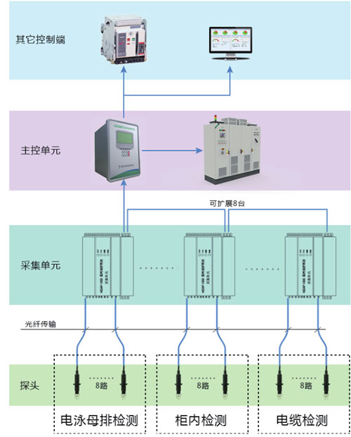 一個主控單元能同時保護(hù)幾個檢測區(qū)域,因此弧光微機監(jiān)控系統(tǒng)的采集單元可以分散到不同的位置,把檢測到的弧光信號傳送到主控單元。